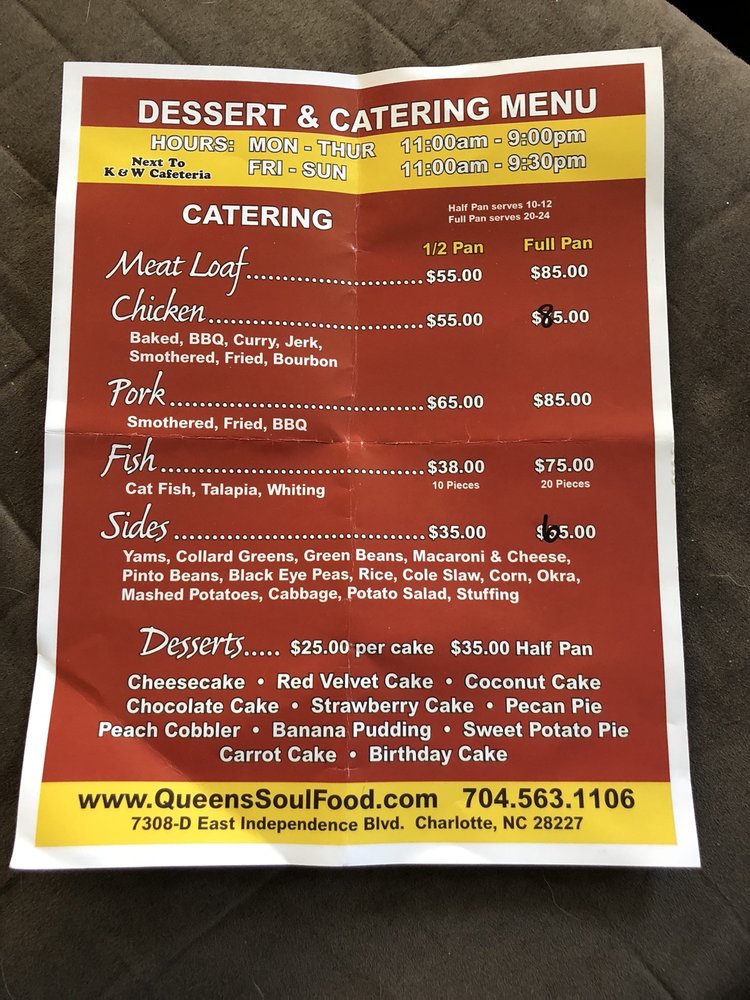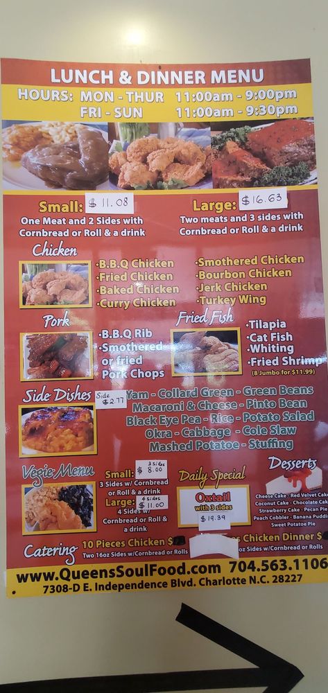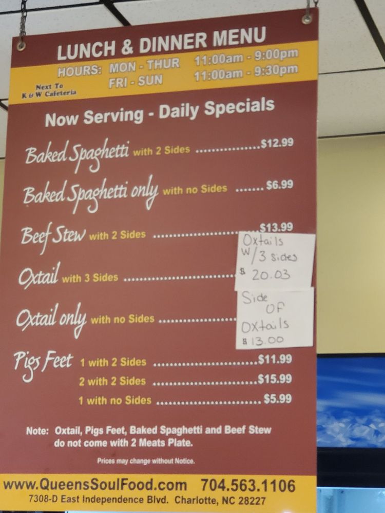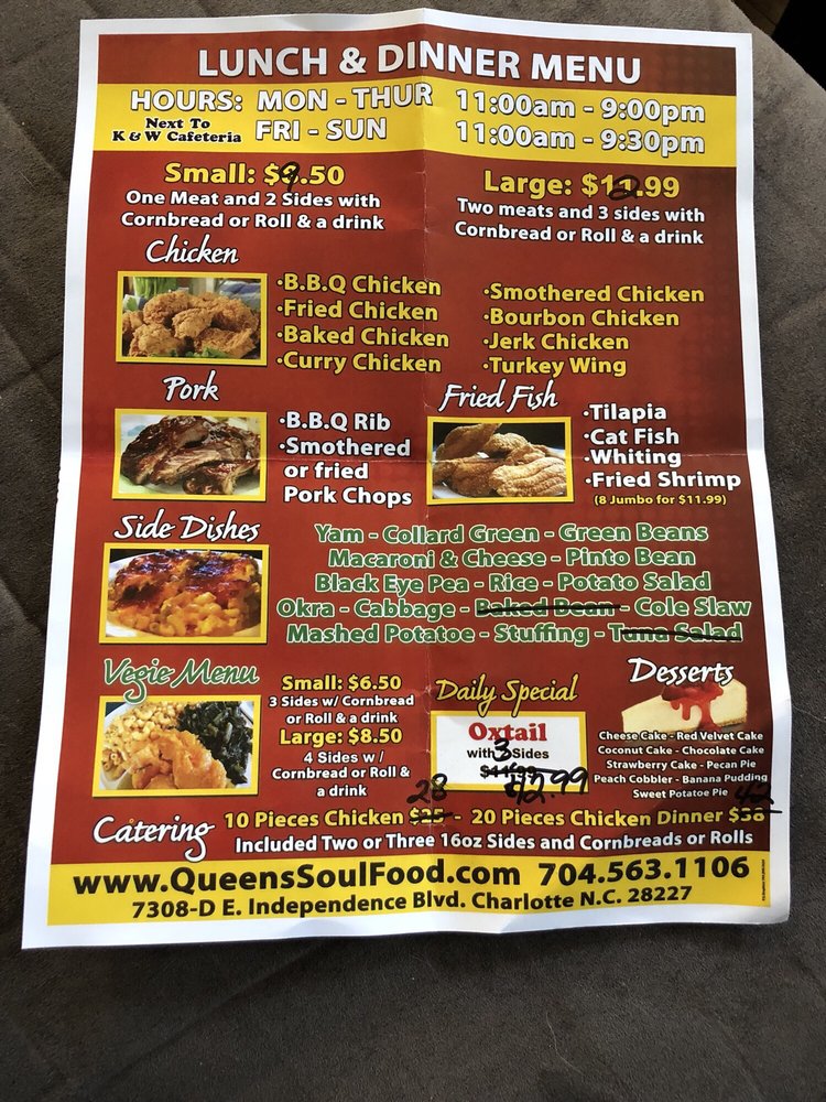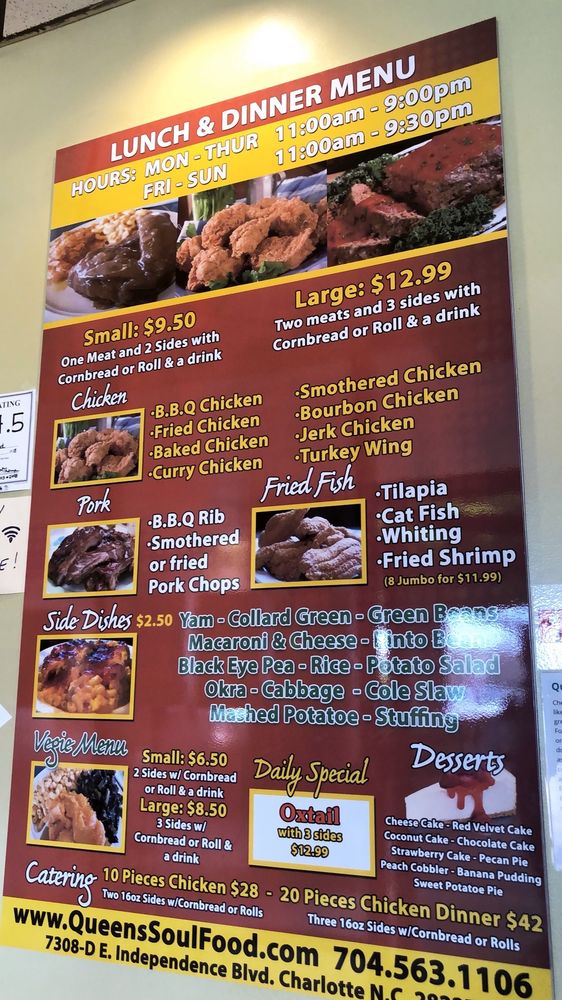 Introducing Queen's Soul Food, a Southern cuisine gem located in Charlotte, NC. This restaurant offers a variety of hearty and flavorful dishes, with options for both meat lovers and vegetarians. The menu features classics like fried chicken, oxtails, curry chicken, and pork chops, all praised by satisfied customers for their deliciousness and generous portions. The a la carte sides including Mac n Cheese, yams, collard greens, and more are also highly recommended. Save room for dessert with indulgent options like banana pudding, cheesecake, and peach cobbler. Queen's Soul Food provides a cozy and welcoming atmosphere, perfect for a family dinner or gathering with friends. Don't miss the chance to experience the authentic taste of home-cooked Southern soul food at Queen's Soul Food.